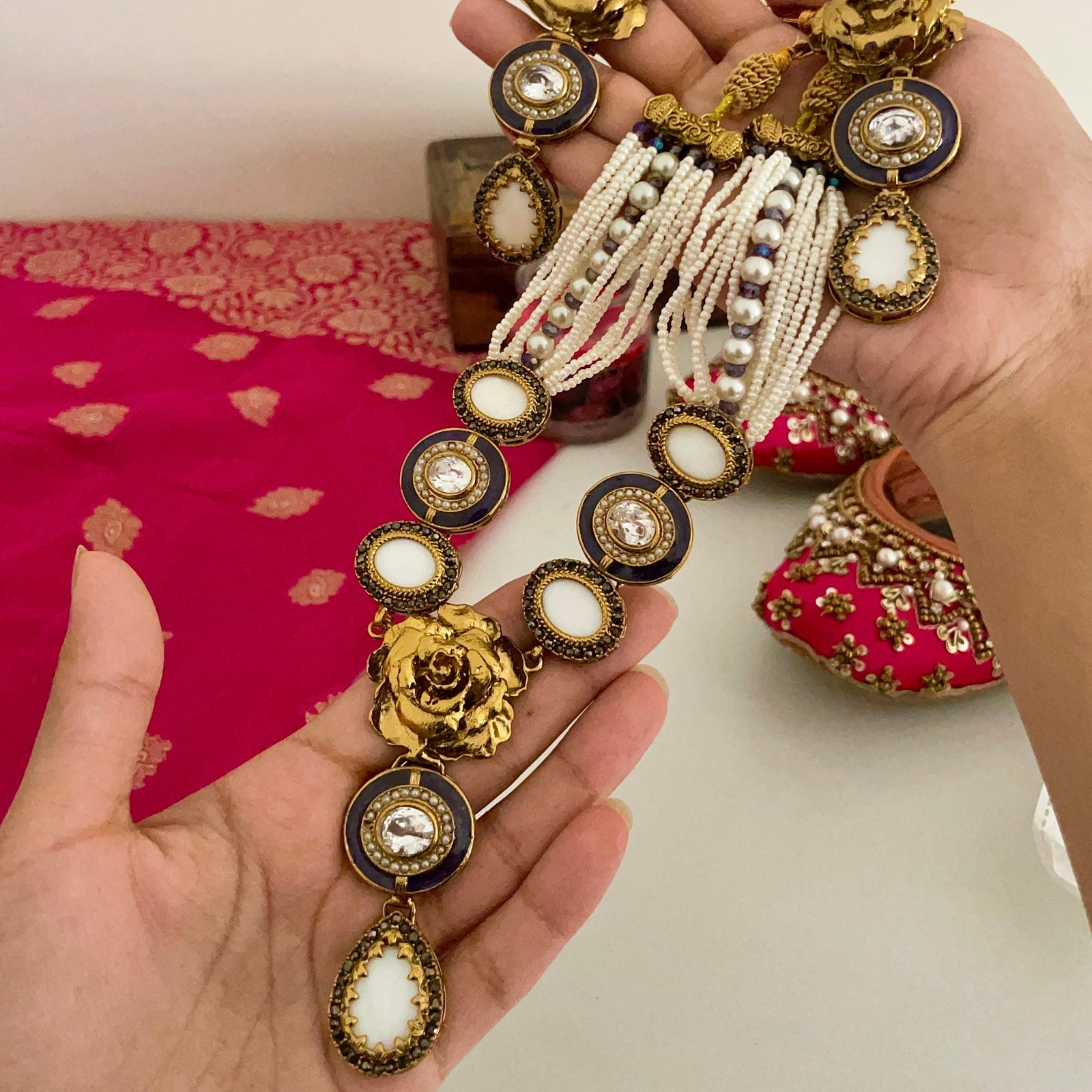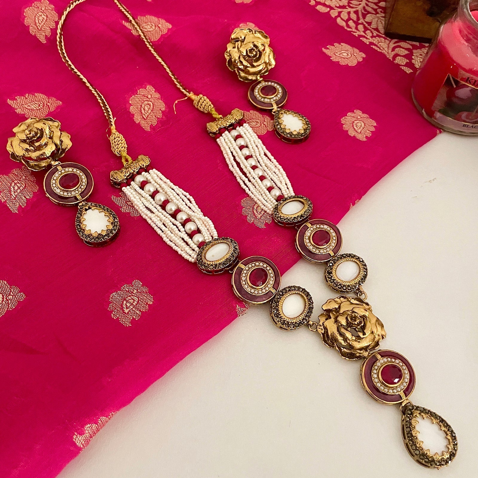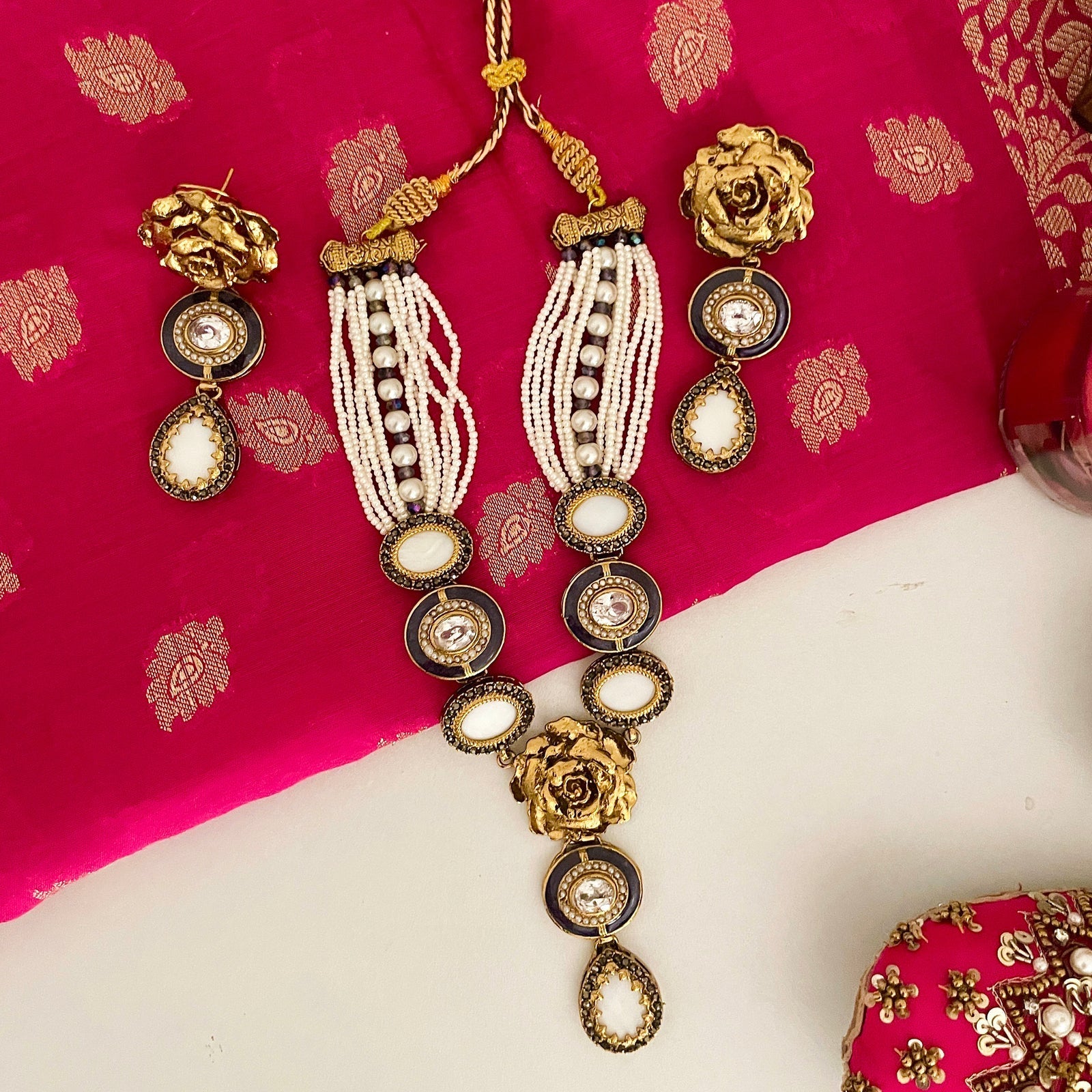 Pearls and Gemstones: The choker and earrings are embellished with lustrous pearls and sparkling gemstones, adding a touch of luxury and glamour.