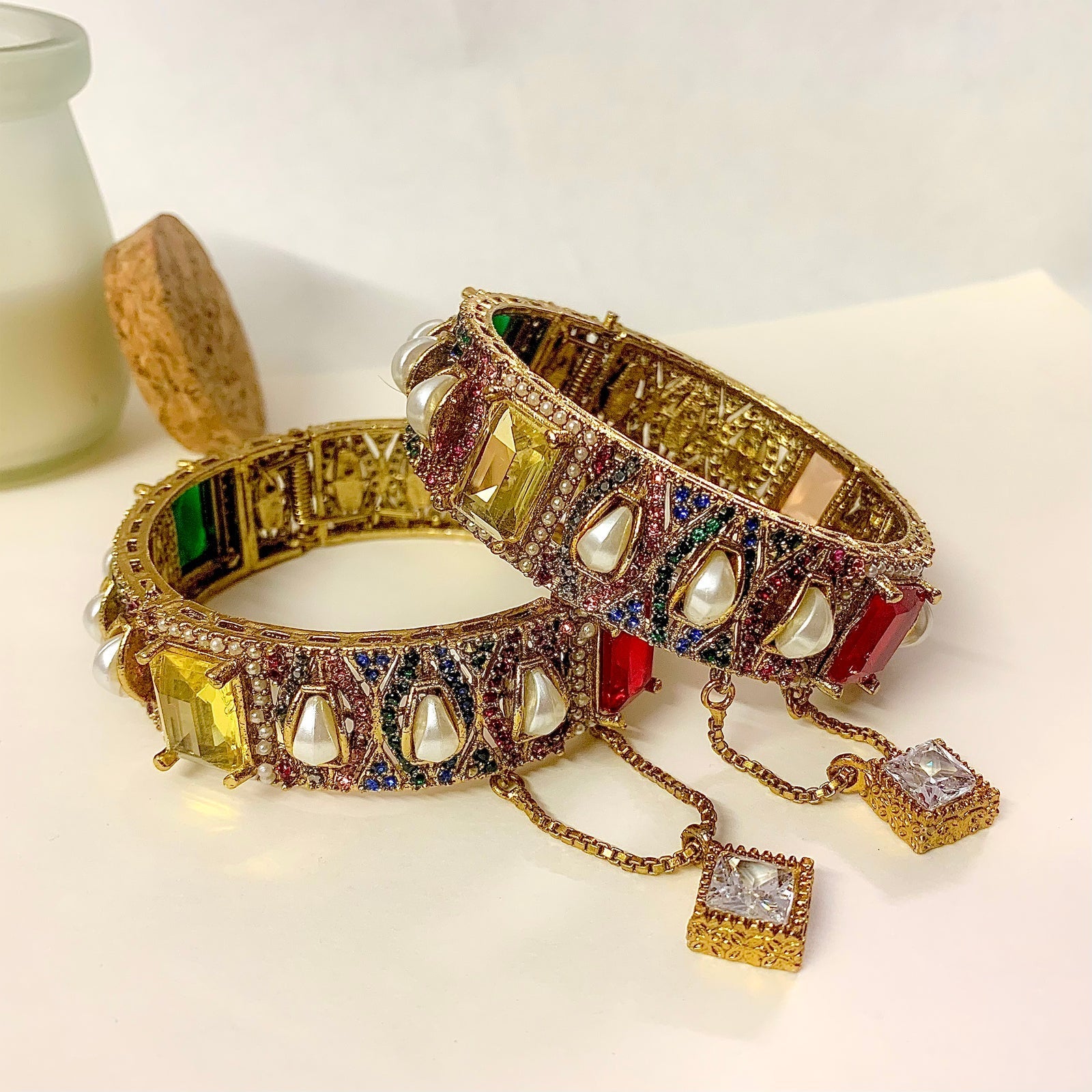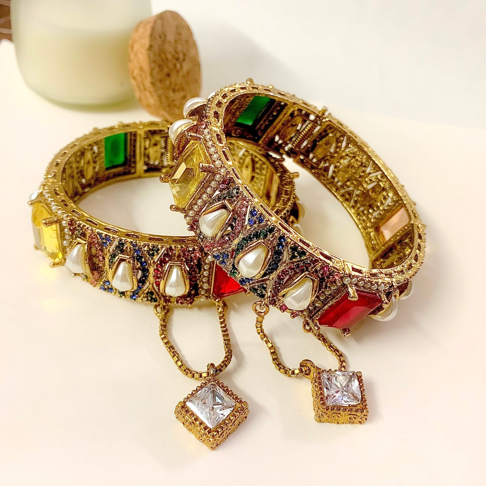 Introducing the "Kangan - Empress of Pearls & Stones," a masterpiece of Indian craftsmanship. This exquisite pair of bangles is adorned with a dazzling array of colorful stones, meticulously set against a backdrop of shimmering gold. The centerpiece of each bangle is a graceful pearl, adding a touch of timeless elegance. These Kangan are designed to make a statement, perfect for special occasions or to elevate your everyday look.