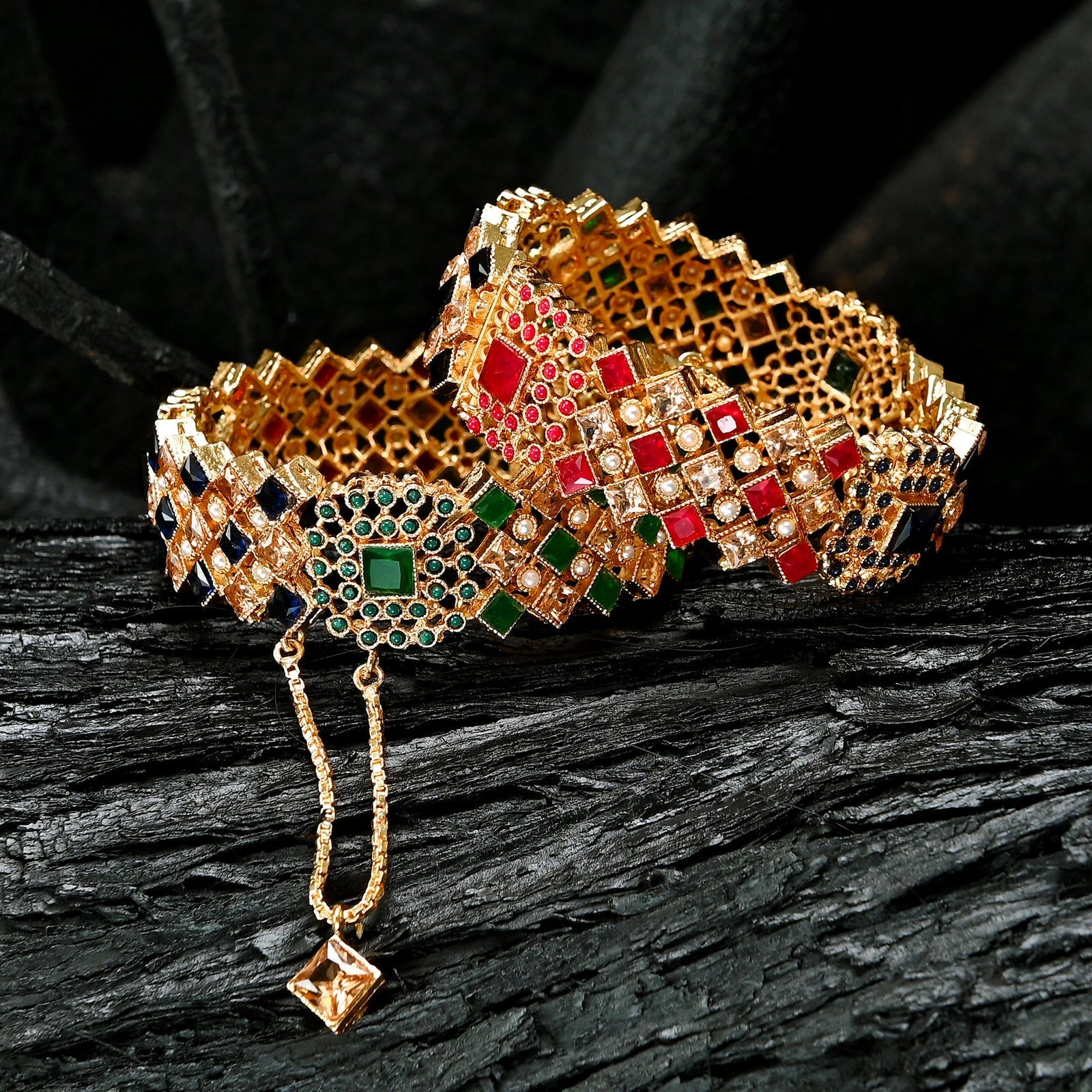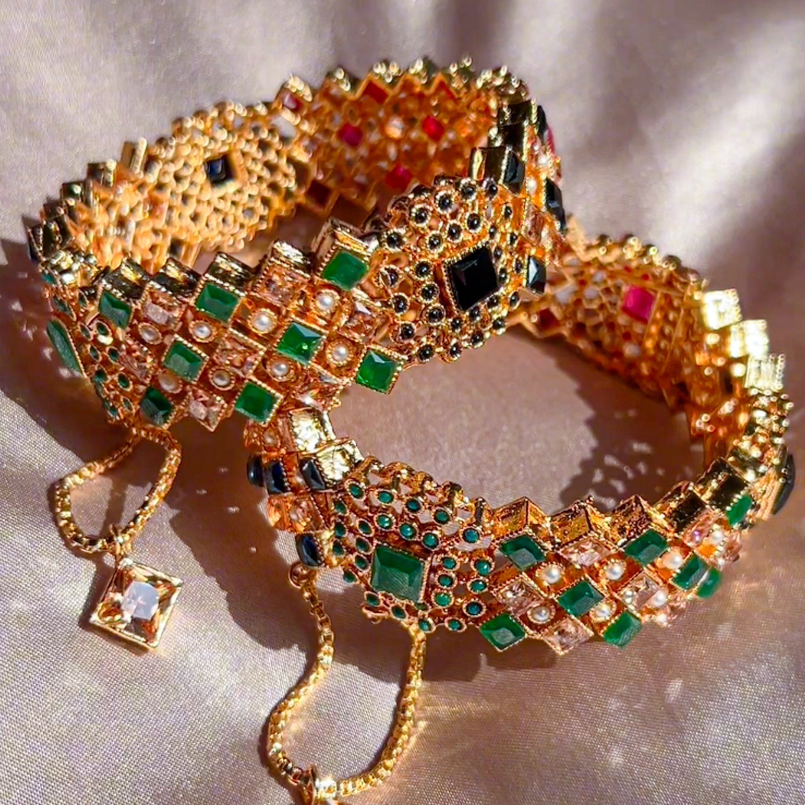 Immerse yourself in opulence with our Royal Empress KB Bangles. These magnificent bangles are a testament to regal elegance and exquisite craftsmanship. Adorned with dazzling stones and intricate detailing, they exude a sense of grandeur fit for royalty. Perfect for special occasions or to elevate your everyday style, these bangles are a must-have for the modern empress.
