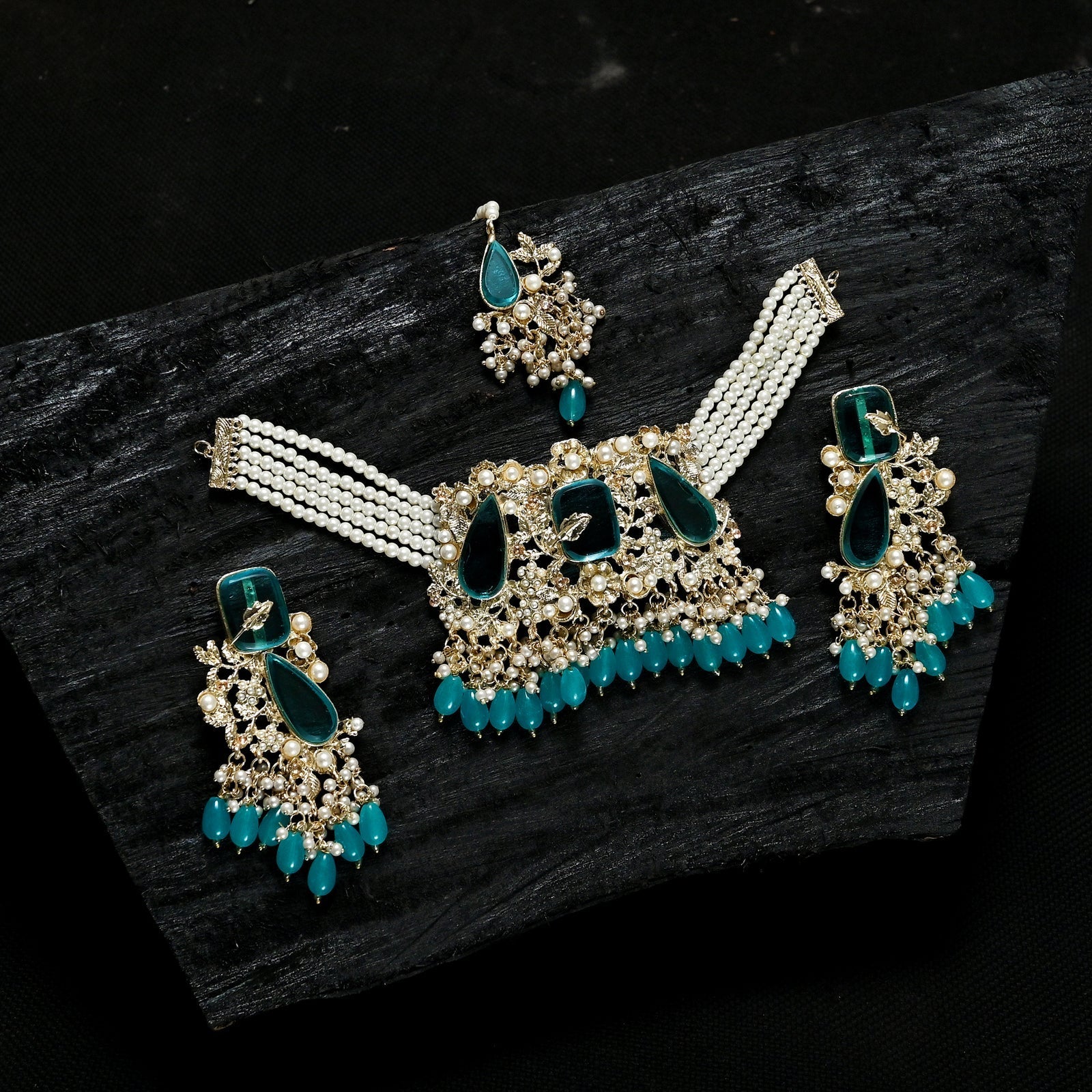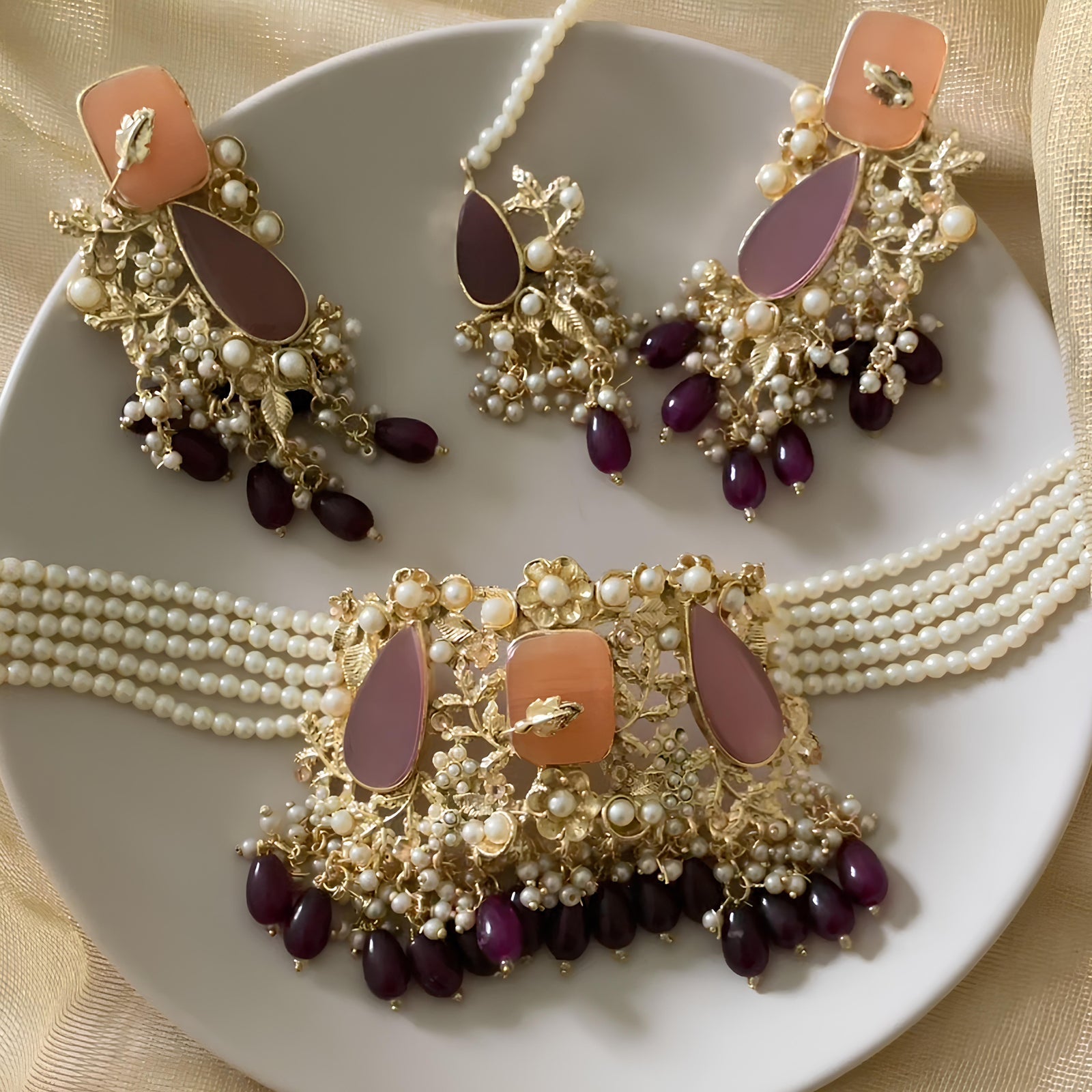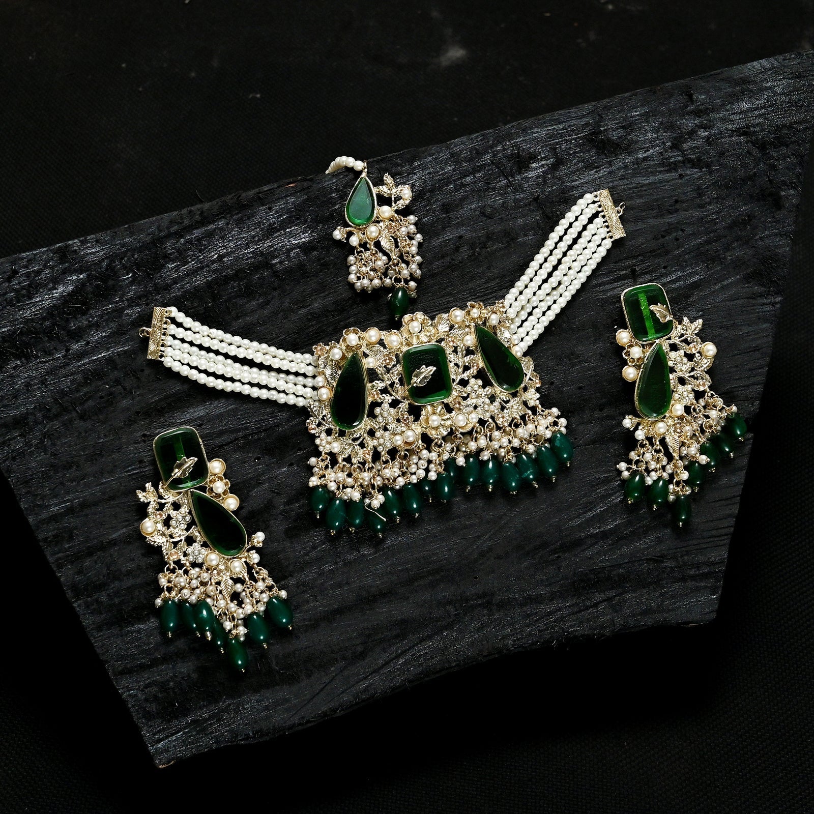 Be captivated by the Emerald Pearl Enchantment choker set, where luminous emeralds meet the soft elegance of pearls. This enchanting piece brings a touch of sophistication and magic to any look.