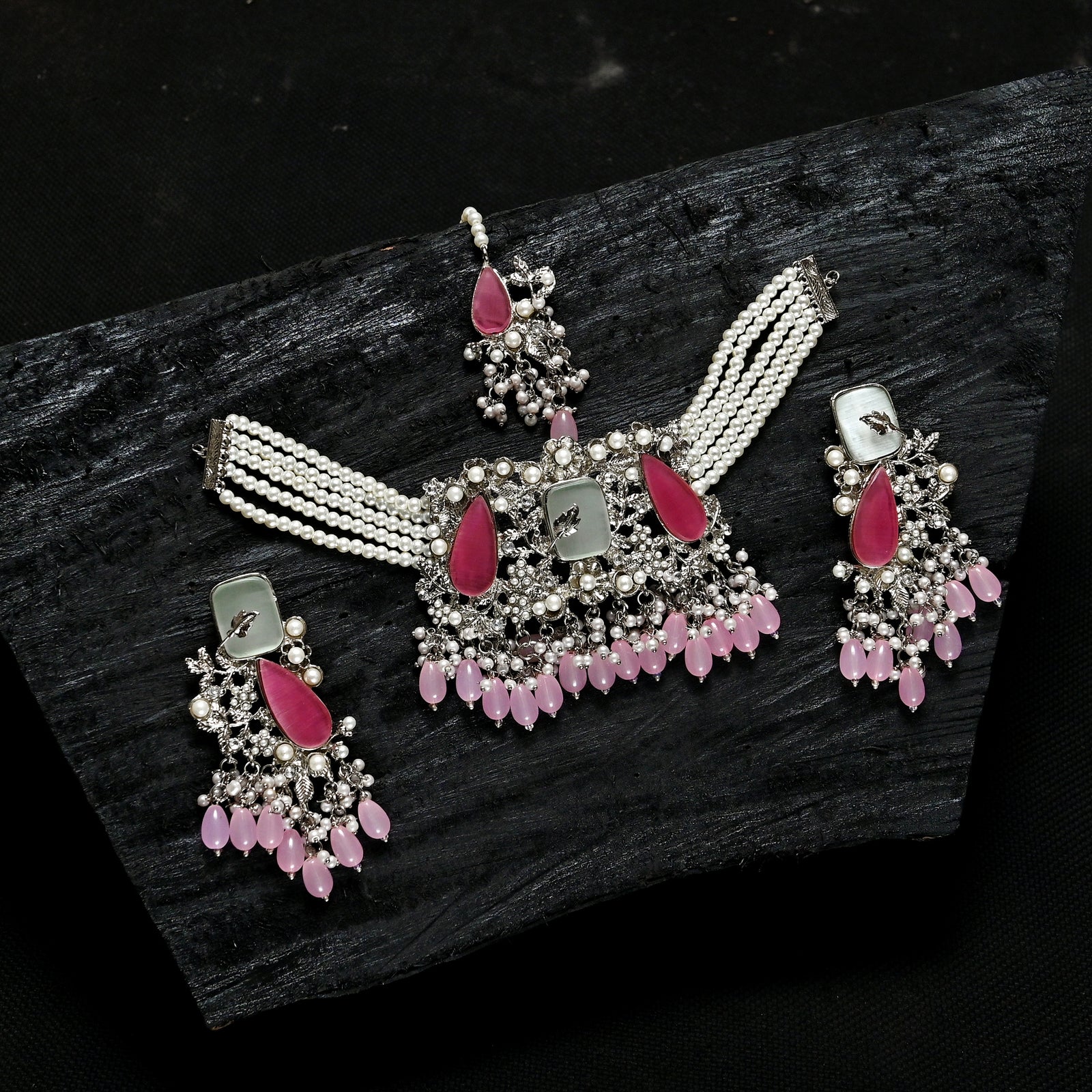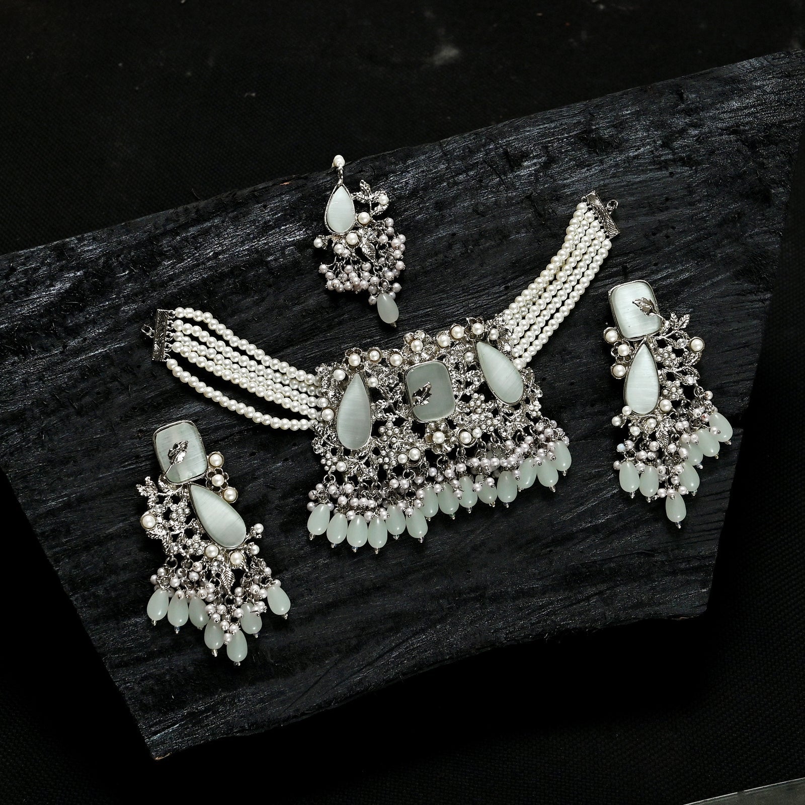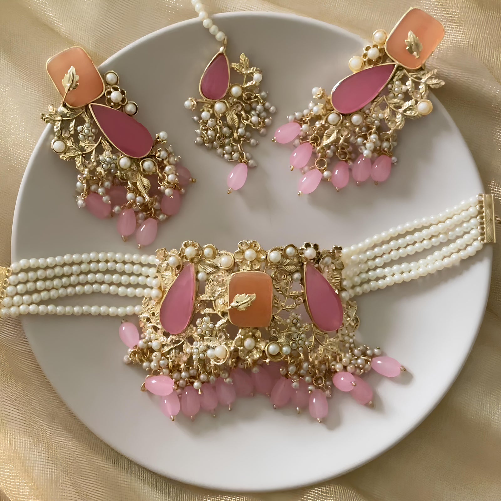 Be captivated by the Emerald Pearl Enchantment choker set, where luminous emeralds meet the soft elegance of pearls. This enchanting piece brings a touch of sophistication and magic to any look.