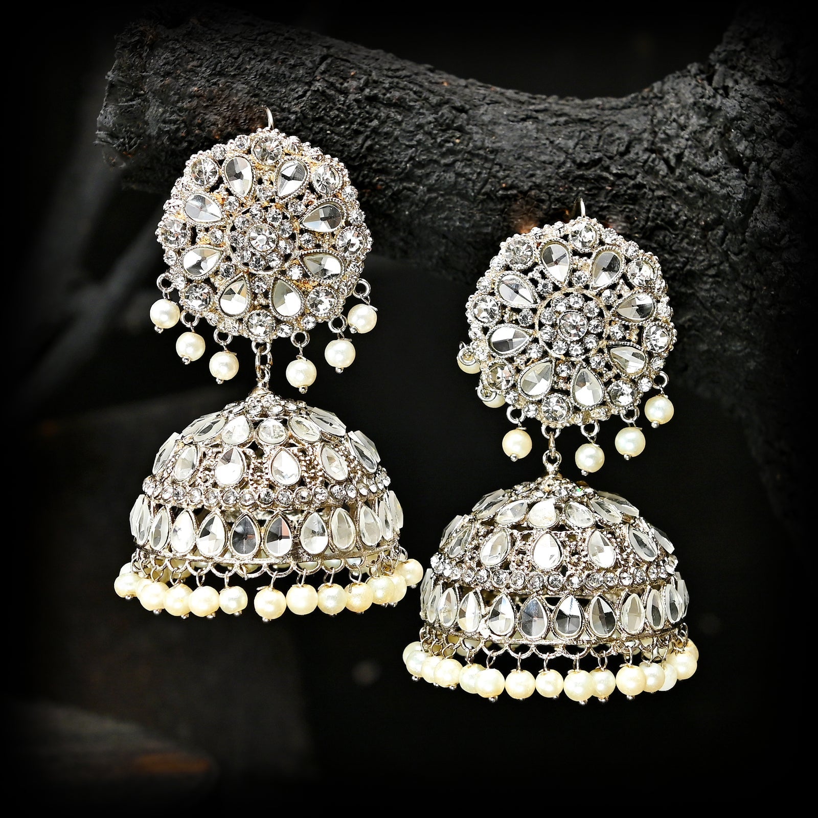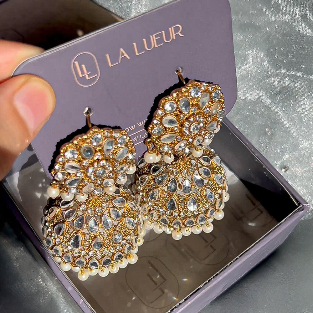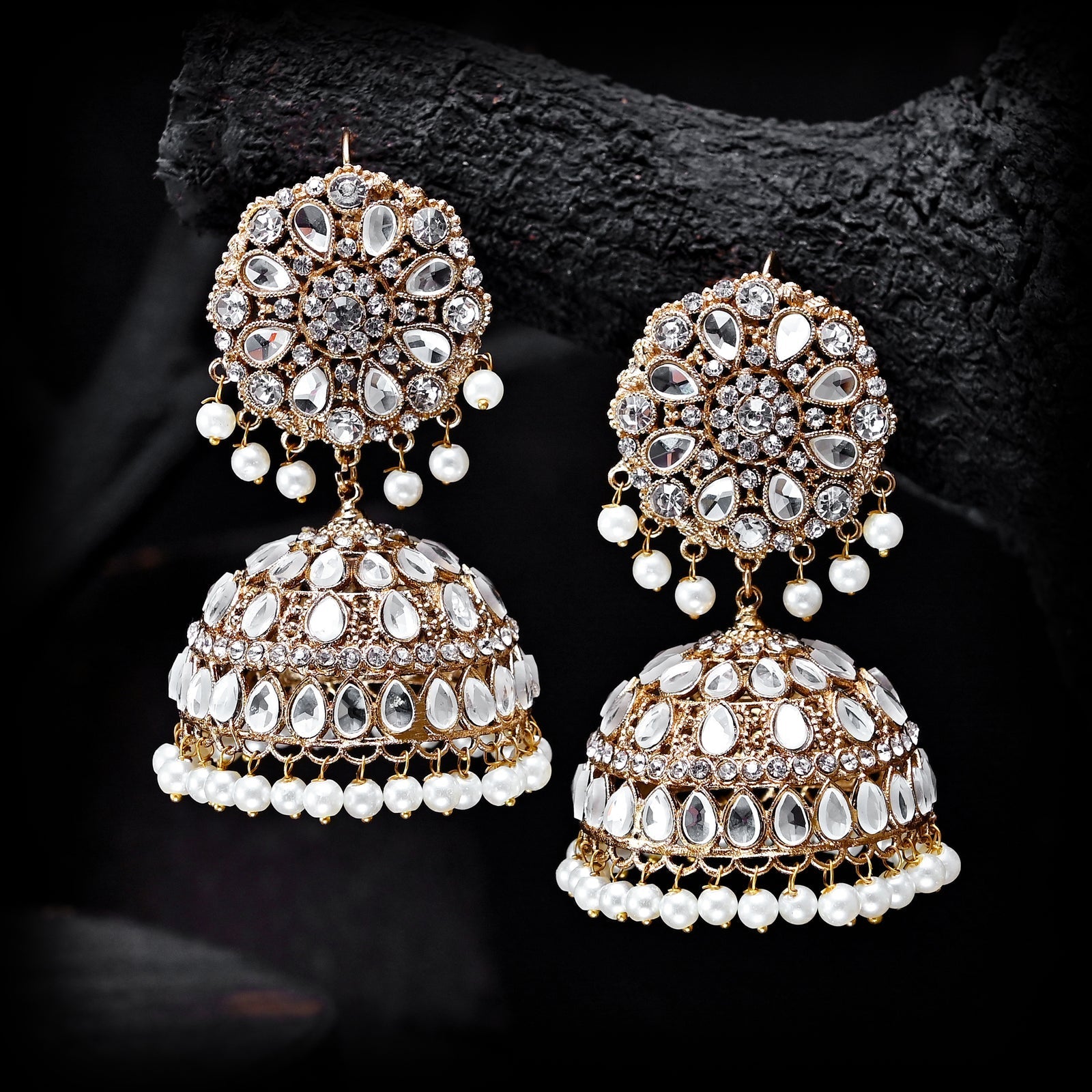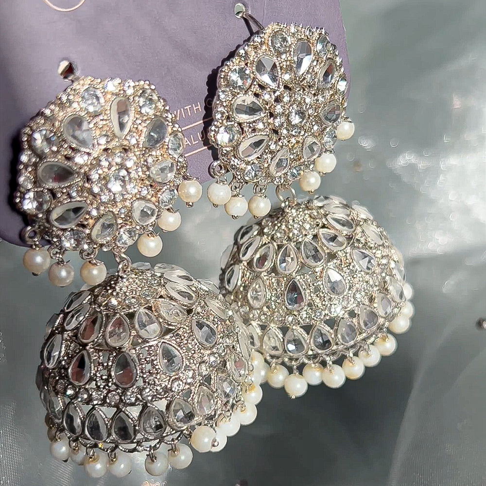 ChandBali Jhumke" are traditional Indian earrings featuring a crescent moon-shaped "ChandBali" design at the top, followed by a bell-shaped "Jhumka." Crafted from materials like gold or silver, they showcase intricate detailing, including filigree work and sometimes gemstones. Available in various sizes, these versatile earrings are suitable for both traditional and formal occasions, often adorned with hanging charms for added visual appeal.