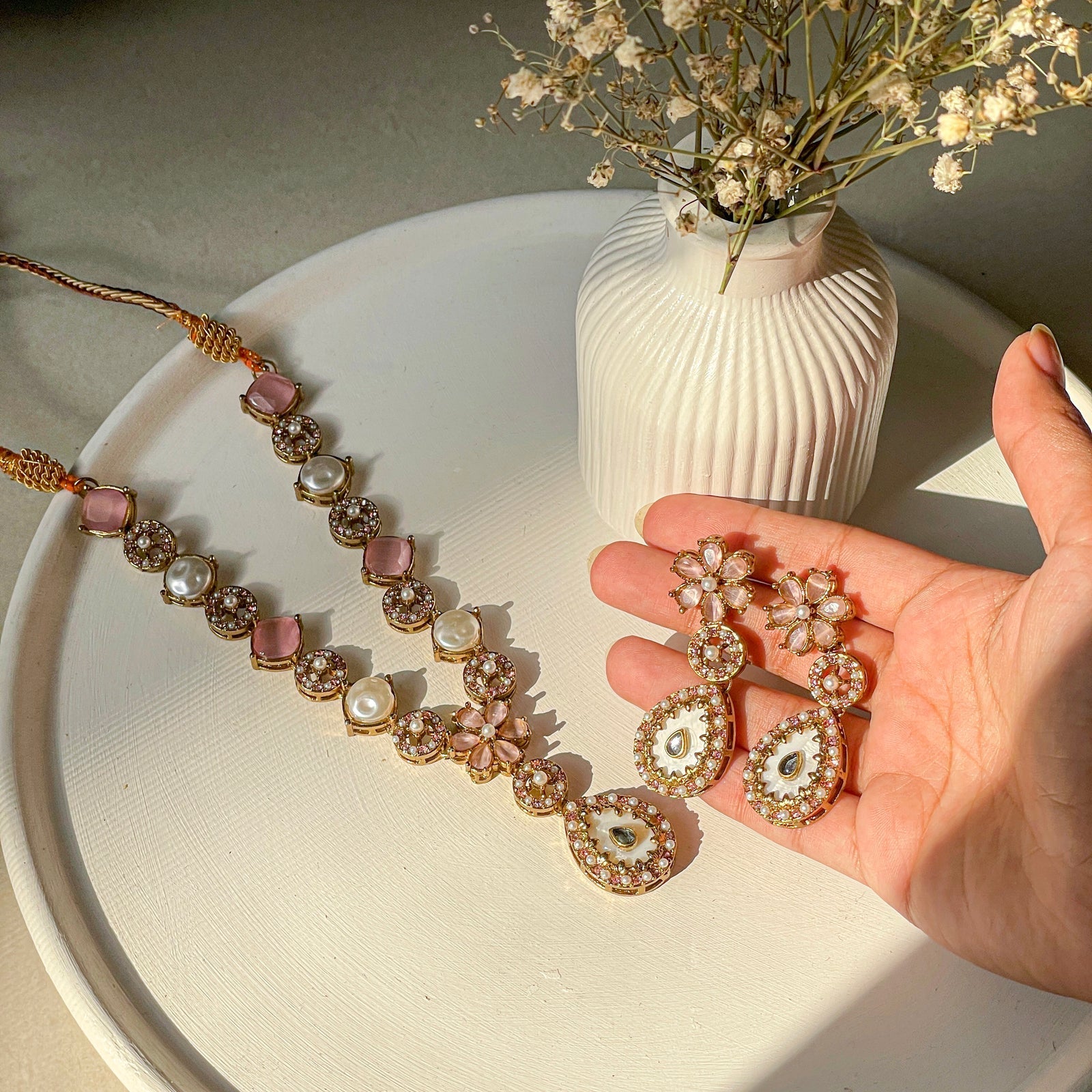 Intricate Design: The necklace showcases a beautiful lotus flower pendant adorned with sparkling gemstones and delicate pearl accents. The matching earrings complement the necklace with their elegant design and harmonious color scheme.