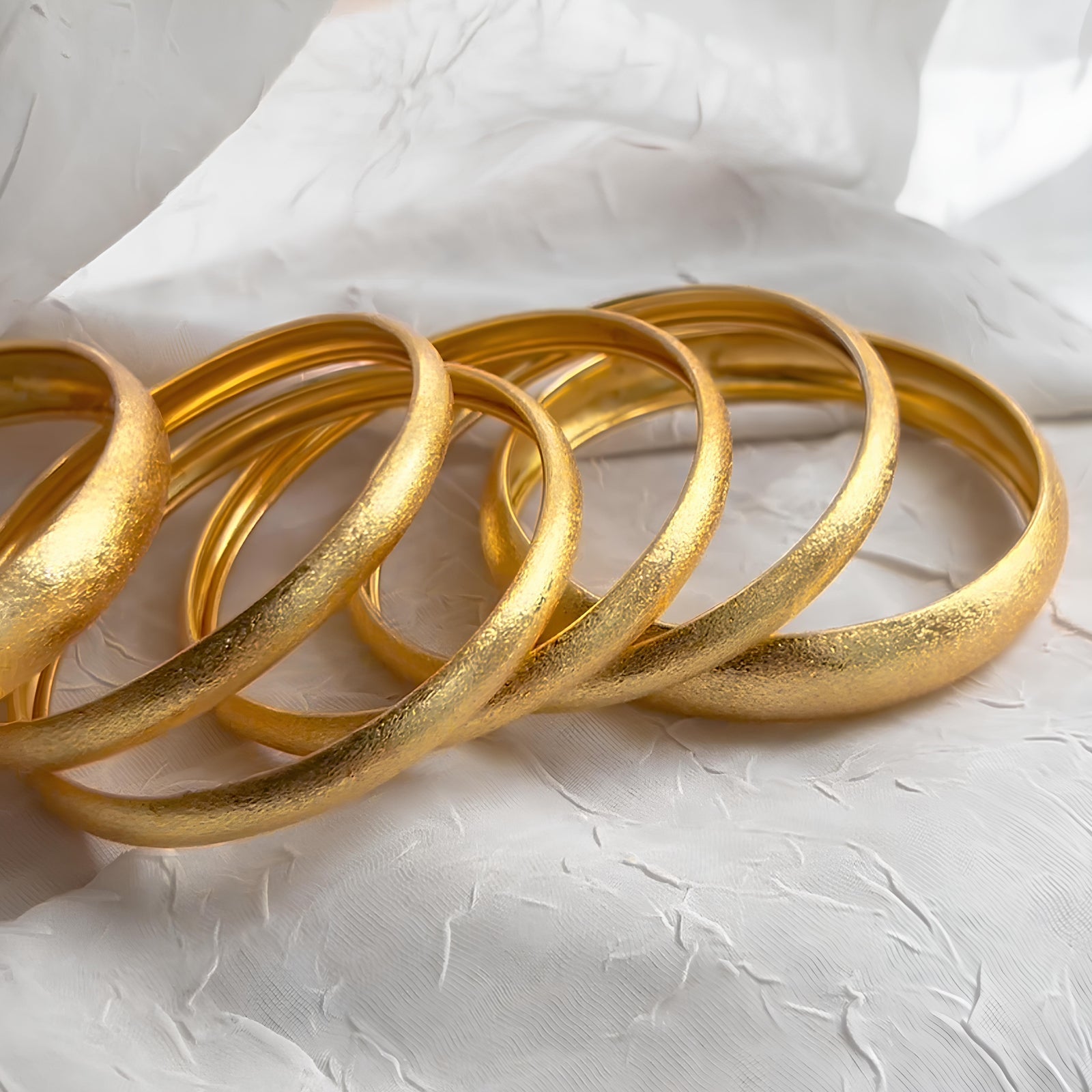 Bangles are circular wrist ornaments crafted from metals, glass, wood, or plastic. Available in plain, engraved, or stone-studded designs, they often hold cultural significance and are worn on special occasions. Stacking multiple bangles is a popular trend, offering a mix of traditional and contemporary style. Maintenance varies by material, with metal needing polishing and delicate ones requiring careful handling. Bangles are timeless accessories, versatile enough for both everyday wear and festive occasions, adding a touch of charm and elegance to any outfit.
