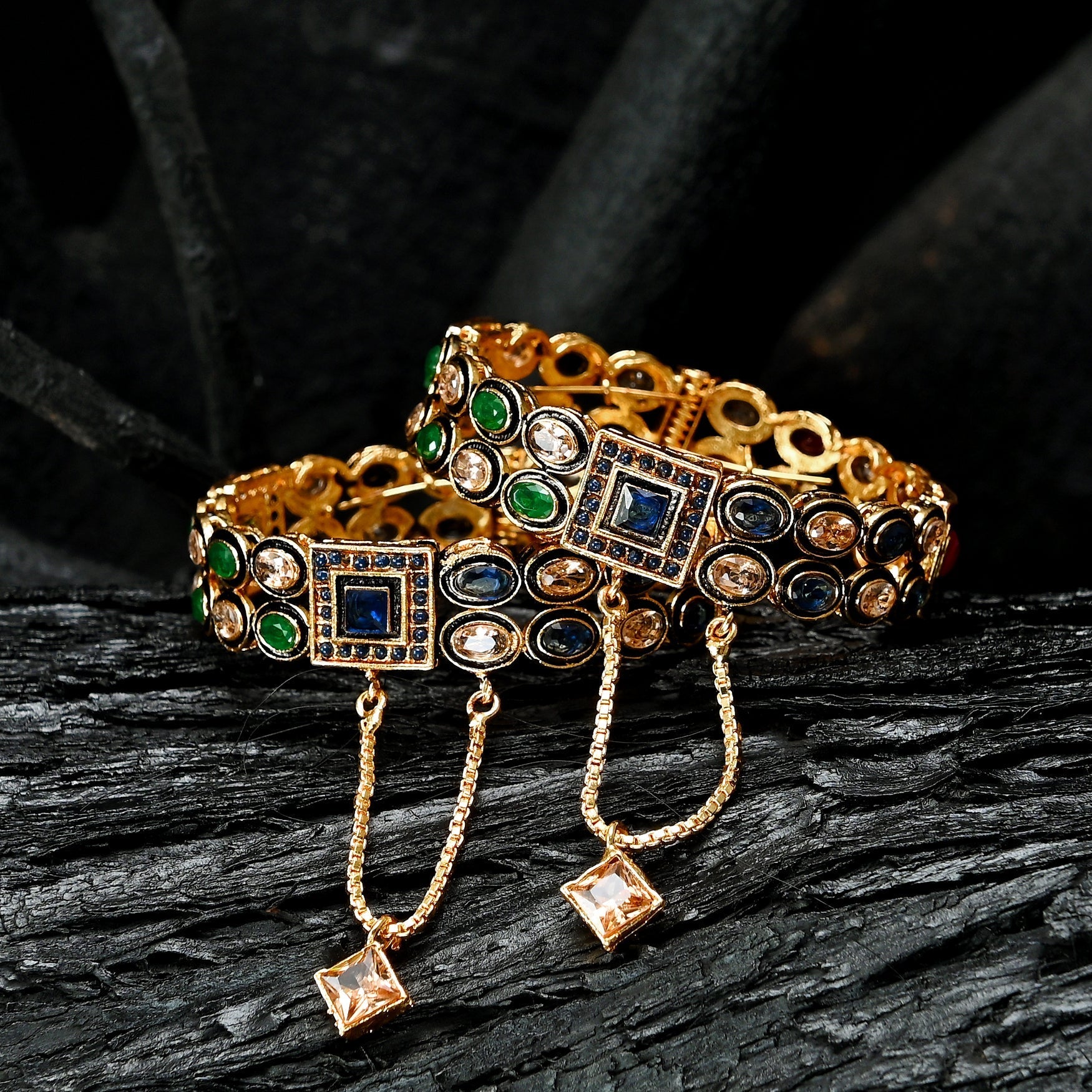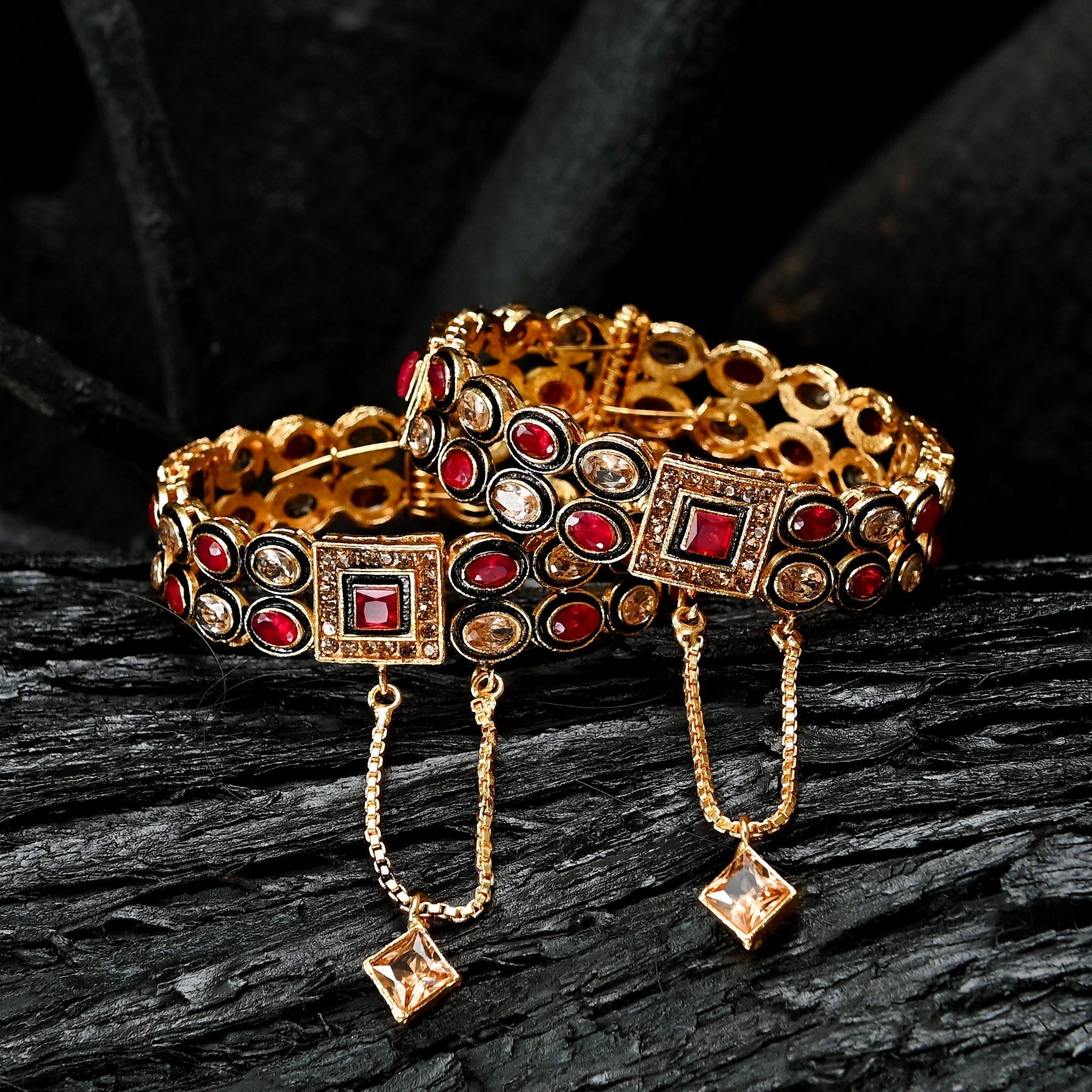 Indulge in the timeless elegance of our Polki and Ruby KB Bangles. These exquisite bangles are a perfect fusion of traditional Indian craftsmanship and contemporary style. Adorned with sparkling polki diamonds and vibrant rubies, they exude a regal charm. The intricate design and luxurious materials make these bangles a statement piece for any occasion.