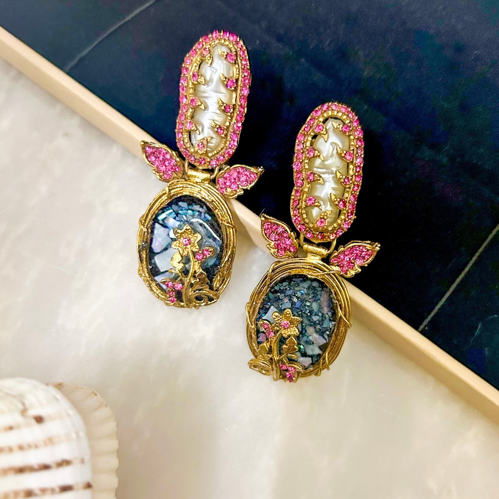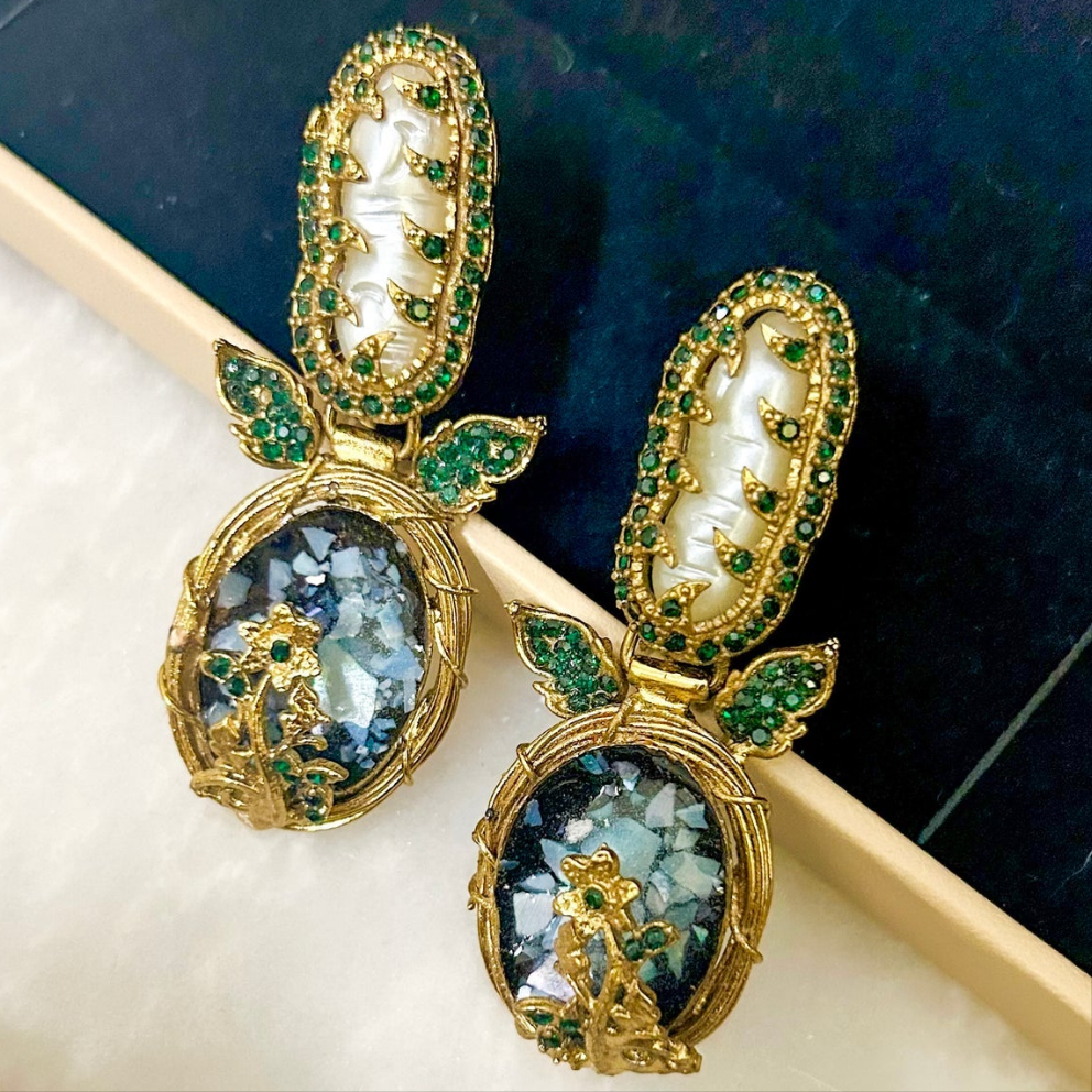 Step into elegance with the Gul-e-Rang Crushed Starlight Earrings, a dazzling blend of vintage charm and celestial beauty. These handcrafted earrings feature a mesmerizing crushed gemstone/resin effect, creating a starlit shimmer reminiscent of a night sky. Adorned with intricate gold-tone detailing and delicate floral embellishments, they exude timeless luxury. Available in multiple stunning colors like Pink, Shocking Pink, Blue, and Crystal Blue, these earrings effortlessly complement any outfit, making them a must-have accessory for every jewelry lover.