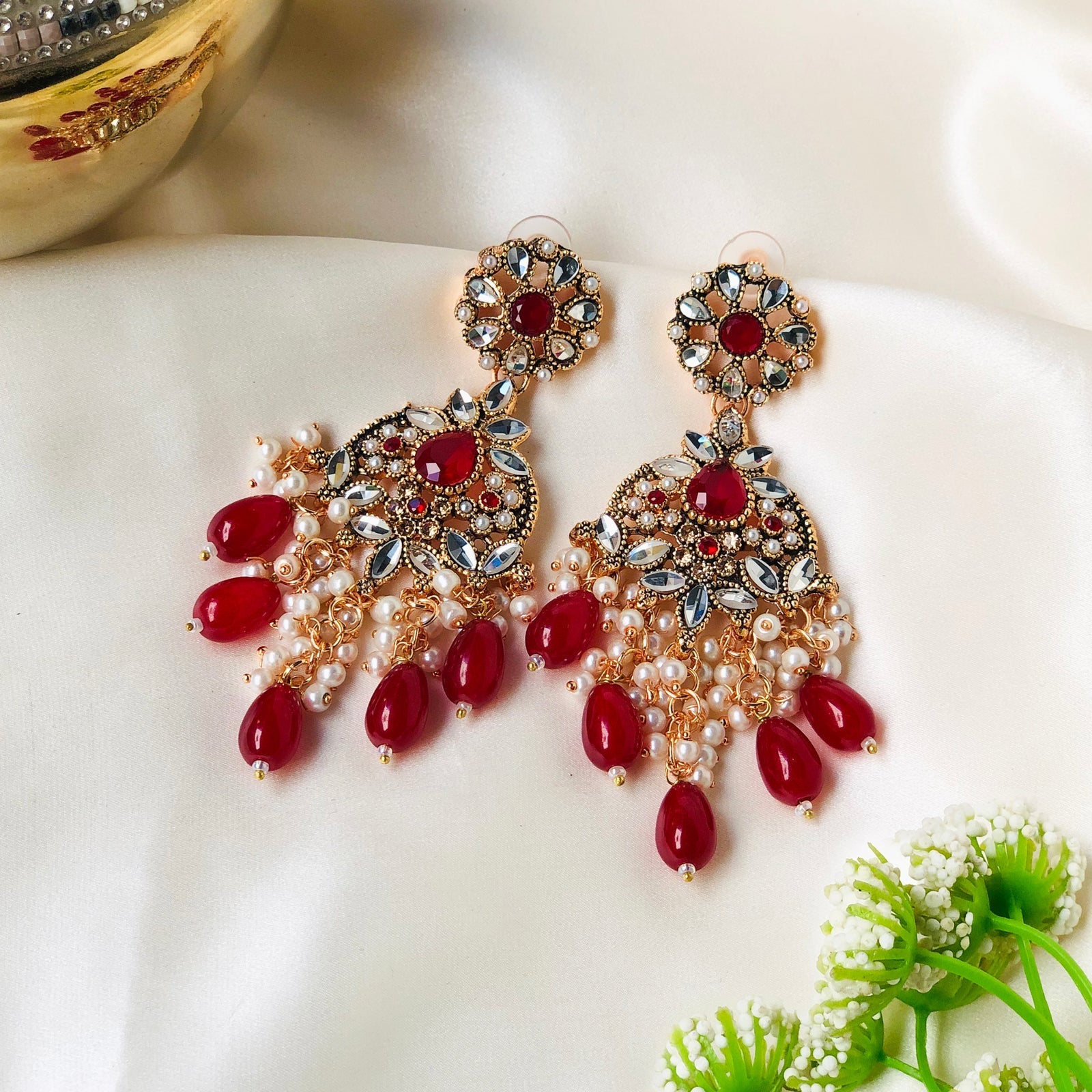 Indulge in the radiant allure of the Mah e Nur Royal Pearl & Crystals Earrings ER-85. These exquisite earrings capture the essence of timeless elegance, blending the classic beauty of pearls with the dazzling sparkle of meticulously placed crystals. Inspired by the celestial glow of 'Mah e Nur' (Moonlight), these earrings are designed to elevate your style with a touch of regal sophistication. Each earring features a delicate floral motif, adorned with lustrous pearls and shimmering crystals, cascading into a graceful chandelier design. Perfect for special occasions, weddings, or adding a touch of luxury to your everyday ensemble, these earrings are a testament to refined craftsmanship and enduring beauty."