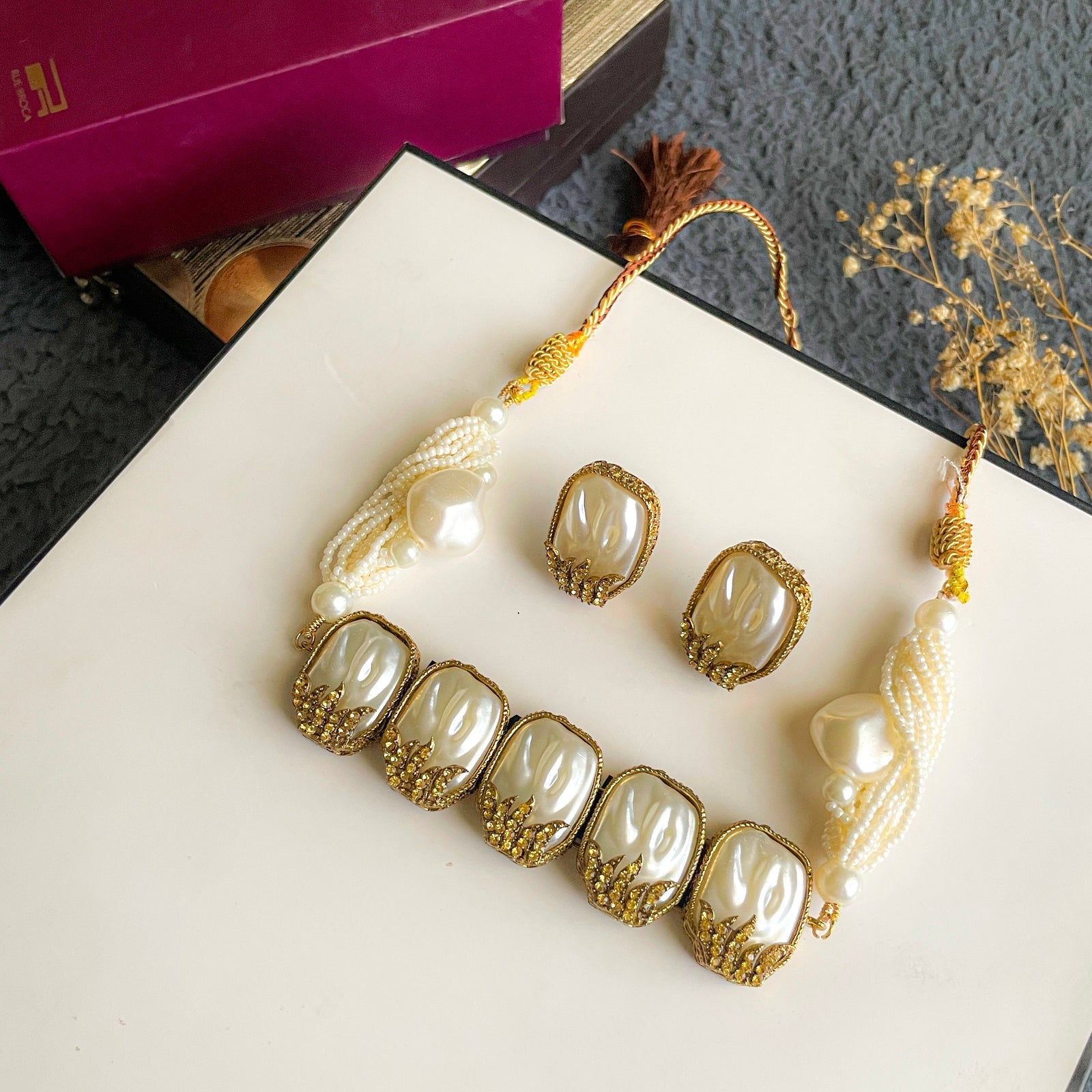 Indulge in the timeless elegance of the Husn-e-Janan Pearls Perfection Choker Set CS-51. This exquisite set is a masterpiece of intricate craftsmanship, adorned with lustrous pearls and sparkling crystals. The choker style necklace and matching earrings create a stunning ensemble that is perfect for any special occasion.